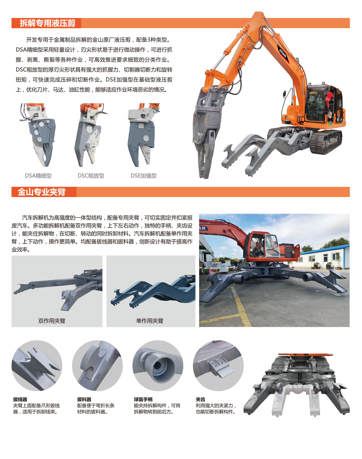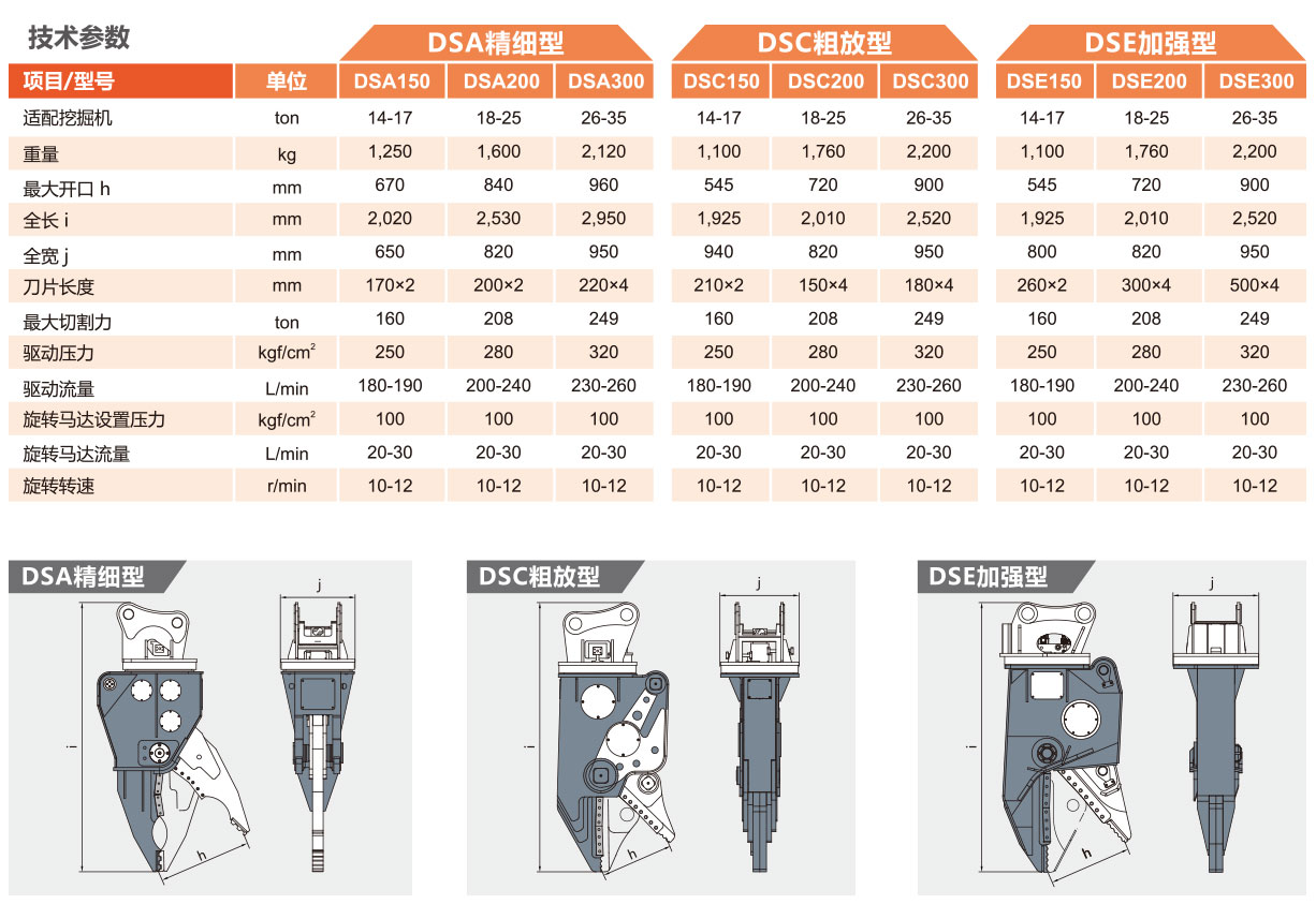 開發(fā)專用于金屬制品拆解的金山原廠液壓剪,配備3種類型。DSA液壓剪采用輕量設計,刃尖形狀易于進行微動操作,可進行抓握、剝離、撕裂等各種作業(yè),可高效推進要求細致的分類作業(yè)。DSB液壓剪的厚刃尖形狀具有強大的抓握力、切割器切斷力和旋轉扭矩,可快速完成壓碎和切斷作業(yè)。DSC液壓剪雙開口設計,效率更高。